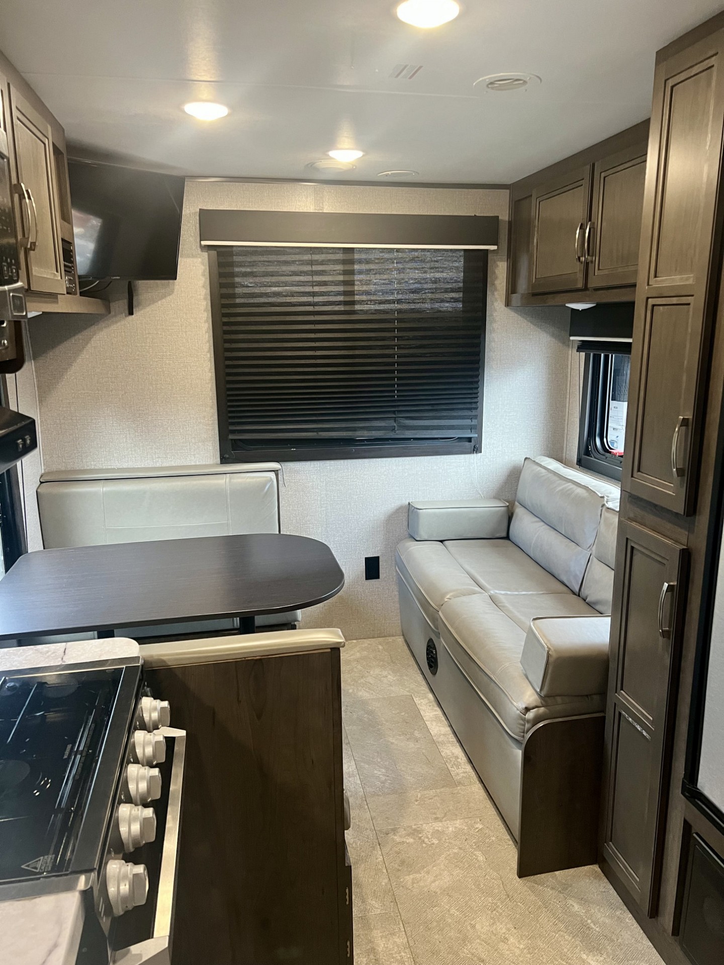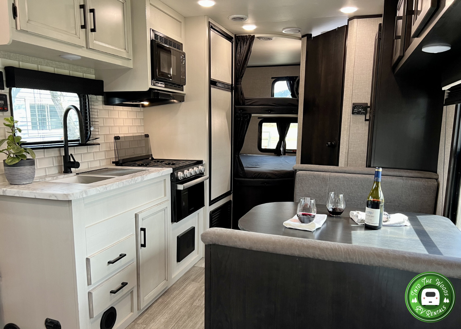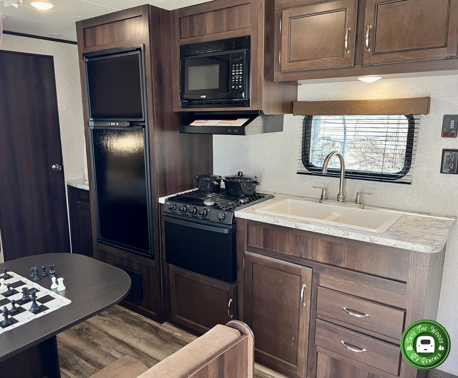 Features a full kitchenette with ​oversized RV refrigerator, 3 burner gas stove, microwave and double sink.
