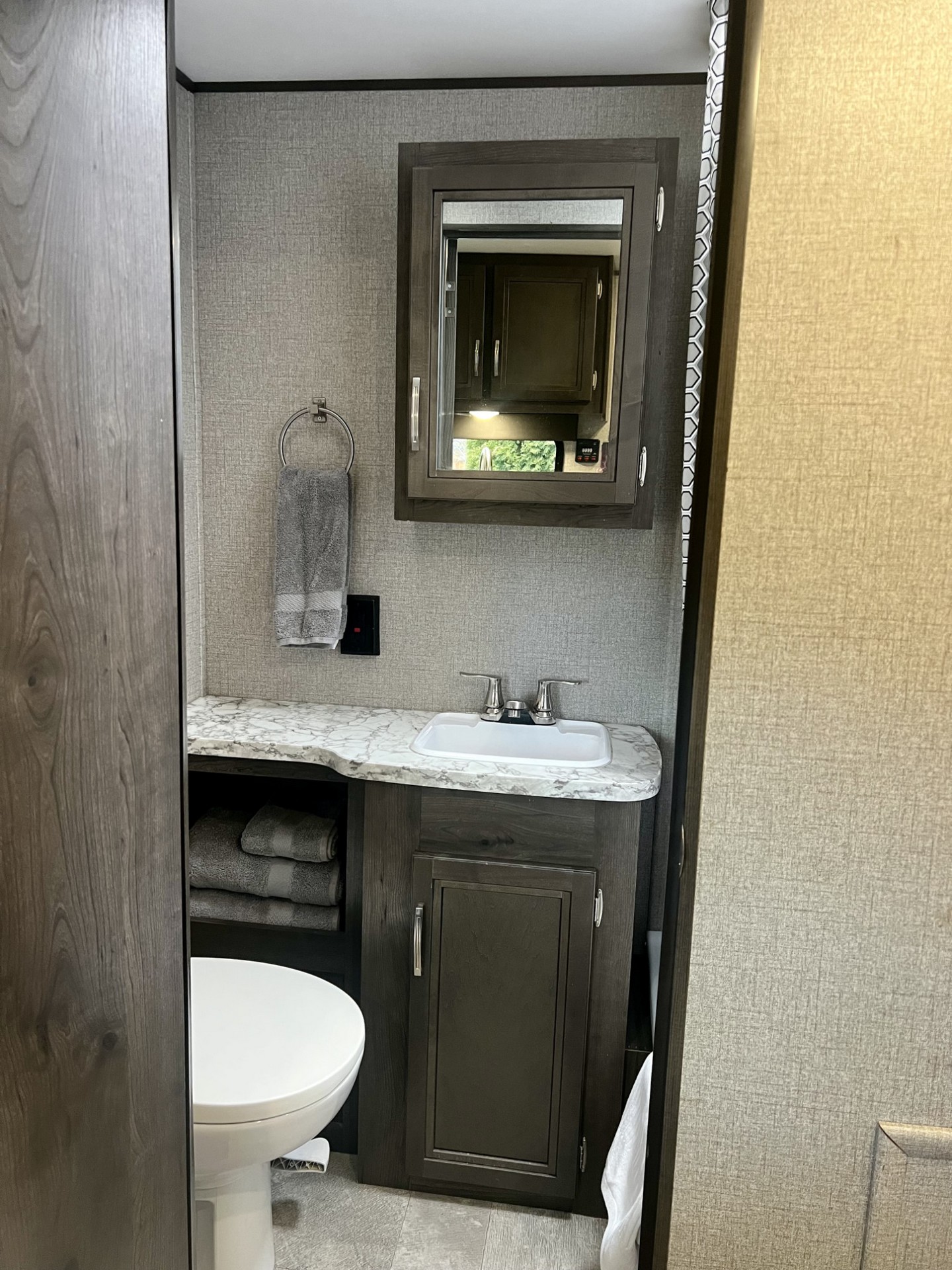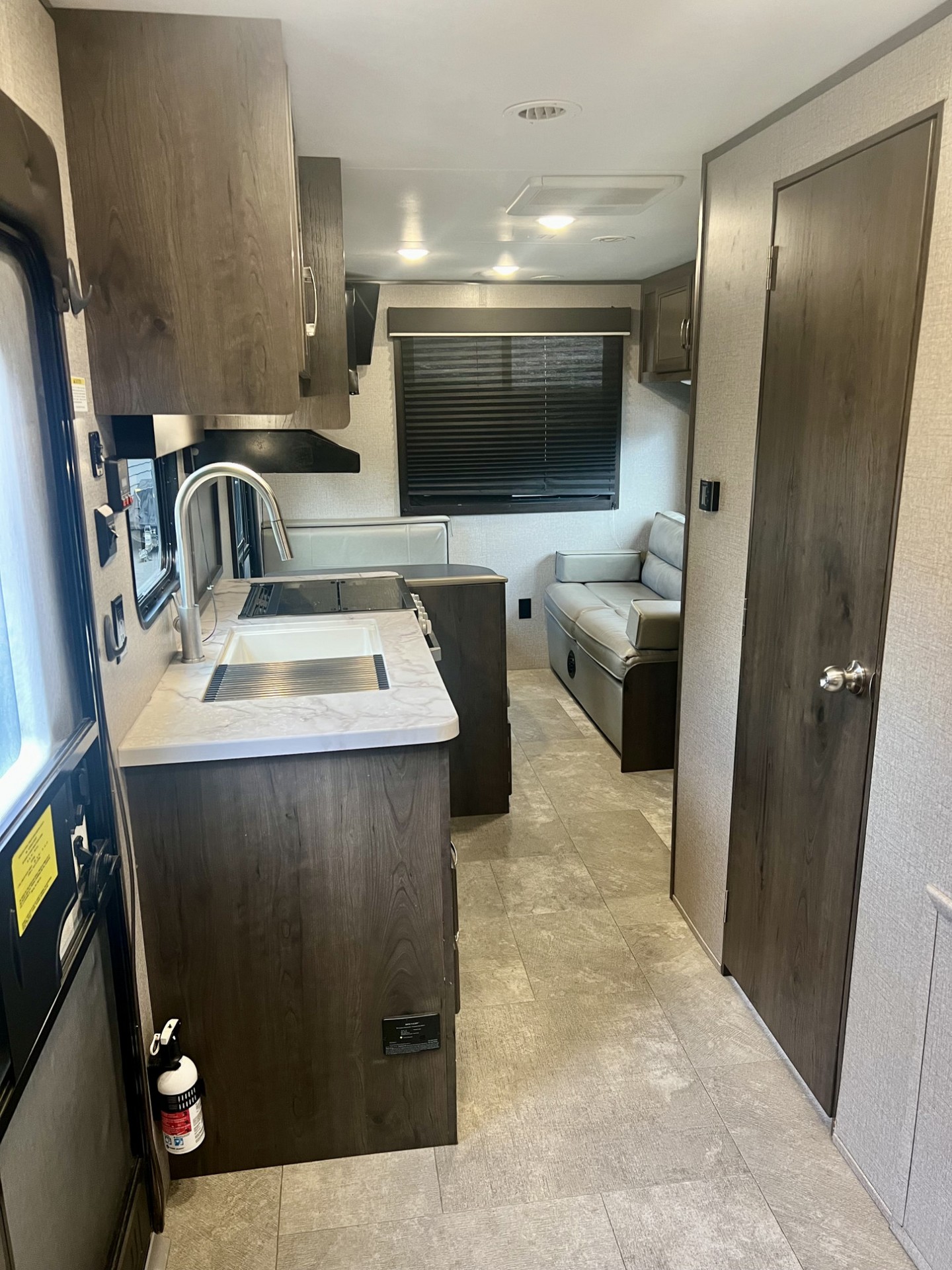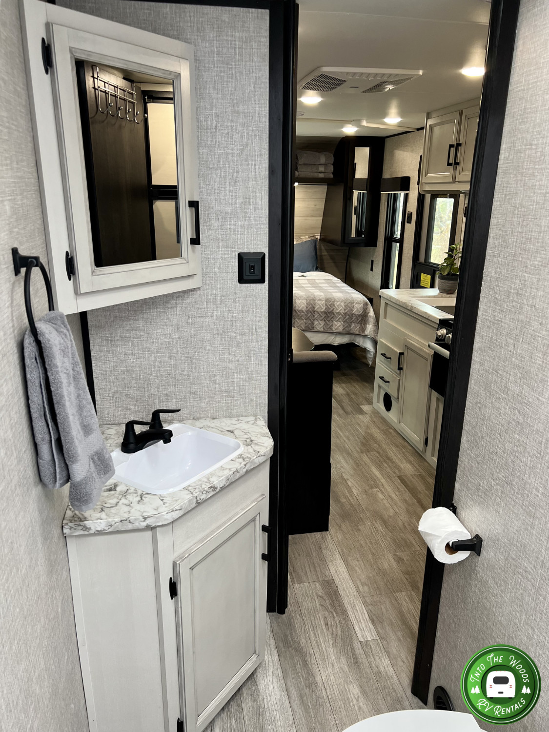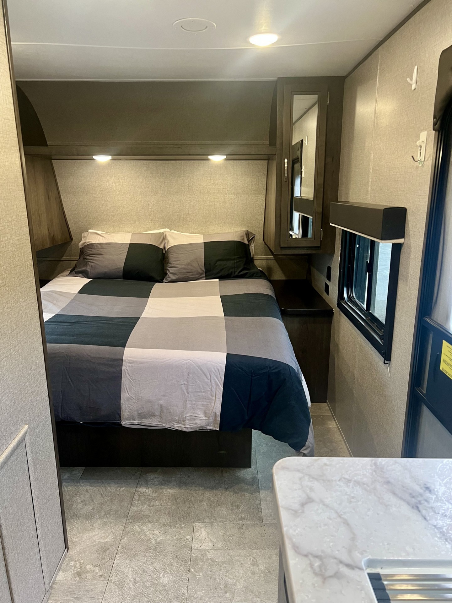 Spectacular 24'Rv with all the amenities an RV has to offer. This unit is 2022, featuring a walk around Queen bed, closet and storage in bedroom, 2 double size rear bunks, oversize RV refrigerator, extra large double kitchen sink with drying rack/extra counter space, outdoor sink and bar fridge (for full hookup only). Oversized shower, vanity with upper cabinet and plenty of floor space in the washroom. Dinette can convert to and additional bed. Full height pantry cupboard for great storage. ​Solar panel with interior charge display, indoor/outdoor speaker system, power awning, 3 step entrance with grab bar handle. Screen entrance door and all screened windows.
